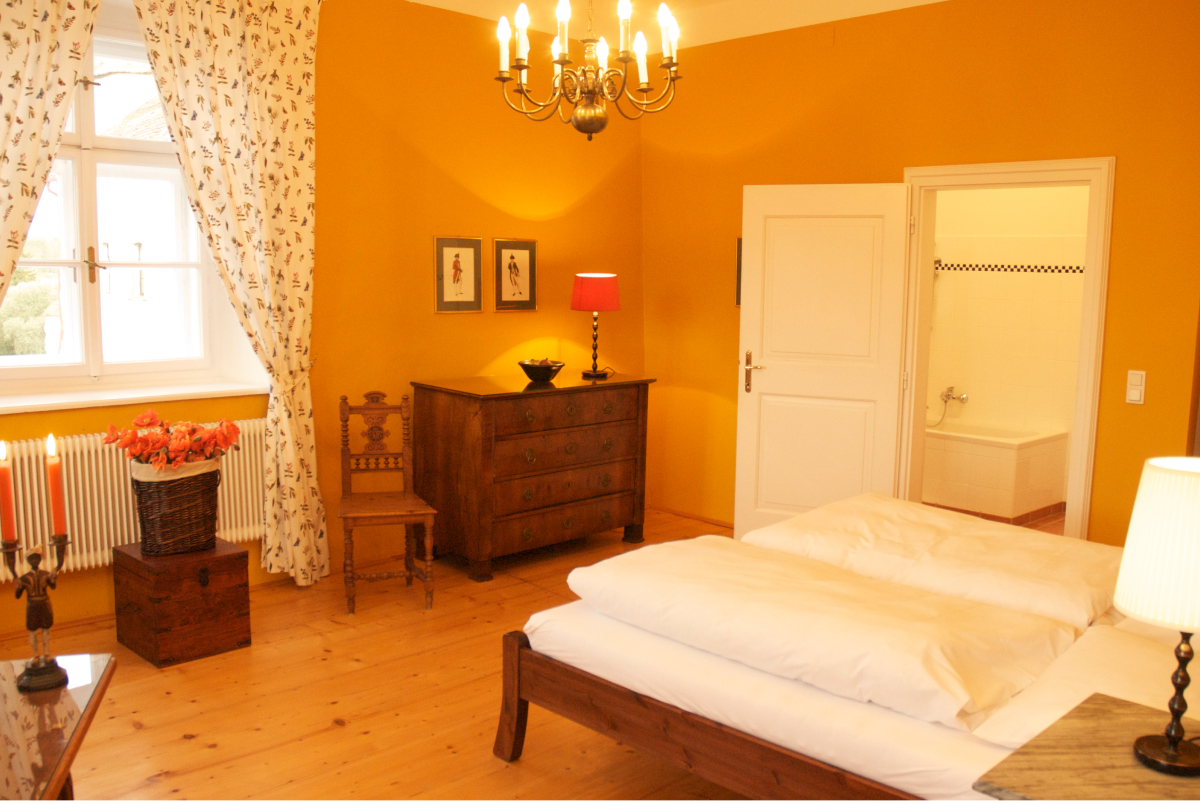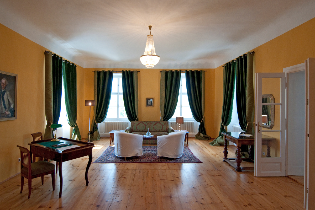 Die Hochzeitssuite „Graf von Colloredo“ (ca 100 m2) im 1. Stock des Schlosses bietet Ausblick auf das Dorf Mailberg, die Weinberge und auf den Schlosshof.