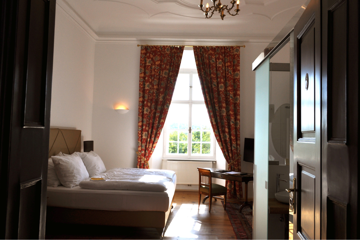 Die Badezimmer verfügen über eine Badewanne oder Dusche, Haartrockner sowie Toilette. Entree und Schlafzimmer sind räumlich voneinander getrennt. Von den nach Süden hin ausgerichteten Schlafzimmern genießen Sie einen schönen Ausblick in den Schlossgarten mit Burggraben und auf die umliegenden Weinberge des nördlichen Niederösterreichs. WLAN ist in allen Gästezimmern kostenfrei verfügbar.