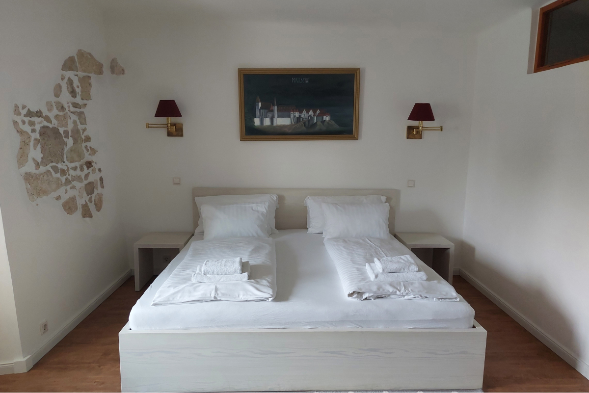 Die Luxus Suite „Fra Bohunko“ (ca 85m2) befindet sich im Erdgeschoss des Schlosses mit Blick auf den Schlossgraben und den Maierhof. Das Schlafzimmer mit BoxspringBett und großem Kleiderkasten ist durch eine Glastür vom Wohnbereich getrennt. Dieser bietet eine Schlafcouch sowie einen Esstisch. Das Badezimmer mit getrenntem WC bietet eine Eck-Badewanne.