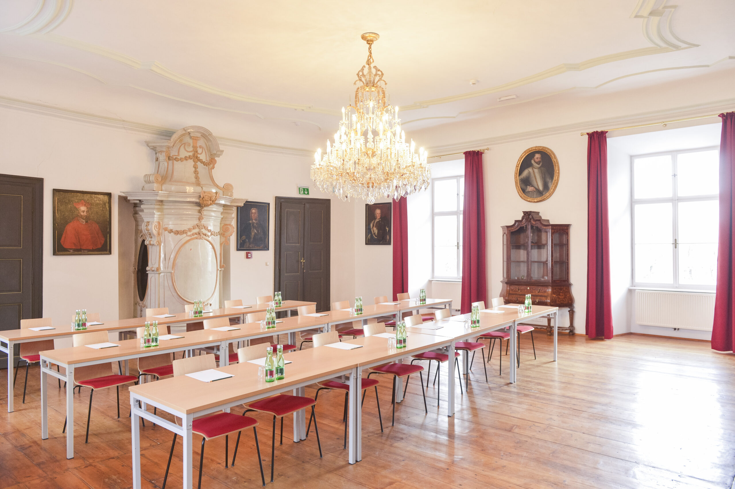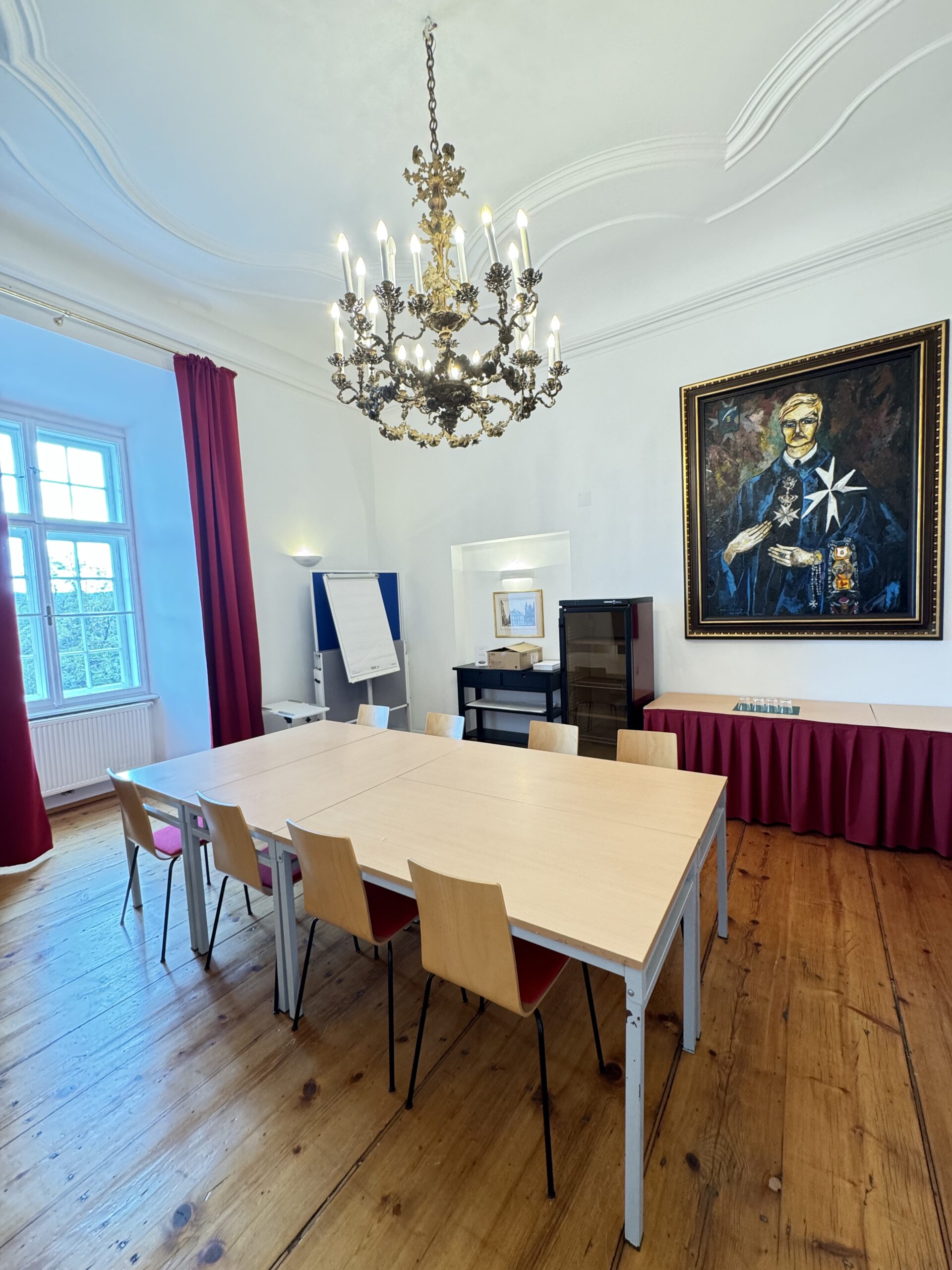 Das 30 m² große Konferenzzimmer ist ein ruhiger Rückzugsort für kleine Seminare, Board-Meetings oder vertrauliche Besprechungen. In Verbindung mit dem angrenzenden Kaminzimmer eignet es sich auch ideal für Gruppenarbeiten und Workshops. In Kombination mit dem angrenzenden Kaminzimmer lässt es sich auch perfekt für Gruppenarbeiten nutzen. Der Blick reicht über den Schlossgraben bis in die Weinberge und schafft eine inspirierende Atmosphäre. Der Raum kann flexibel bestuhlt werden, bietet Tageslicht, ist bei Bedarf verdunkelbar und verfügt über individuell anpassbare Beleuchtung.